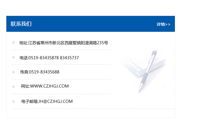 地址:常州市新北區友邦商務大廈1幢16、17層  電話:0519-85101652  傳真:0519-85112595  郵編:213022  網址:www.cz-jiayue_cn.hunanboyuan.com  郵箱:xiajifengaa@163.com